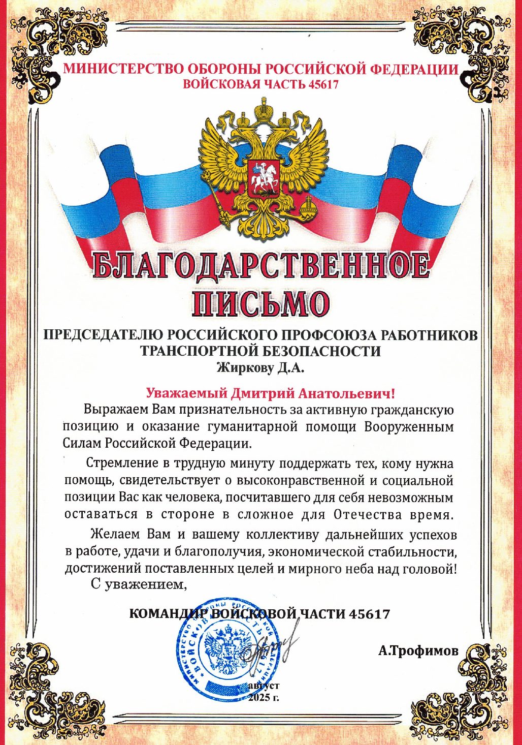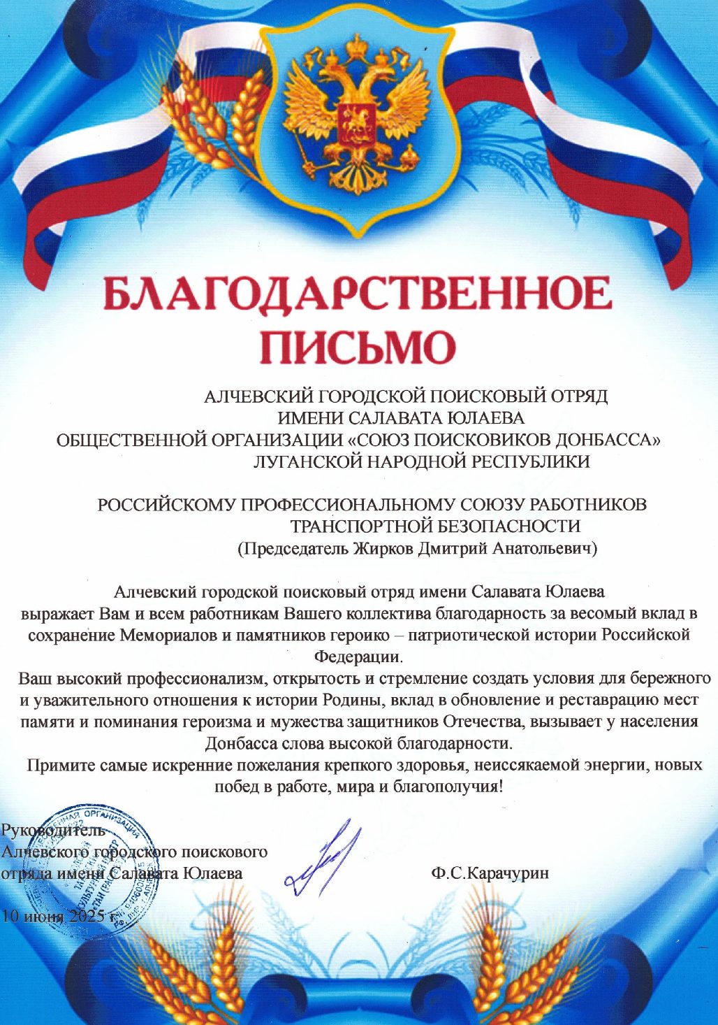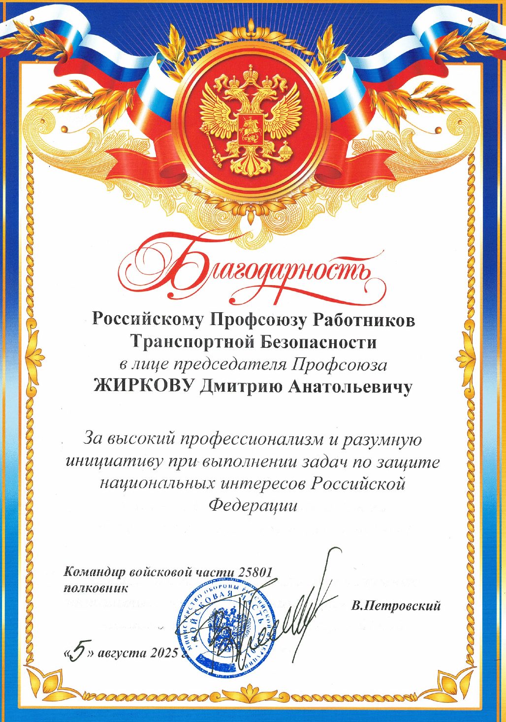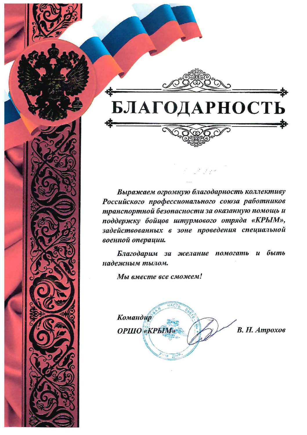 Благодарности Профсоюзу