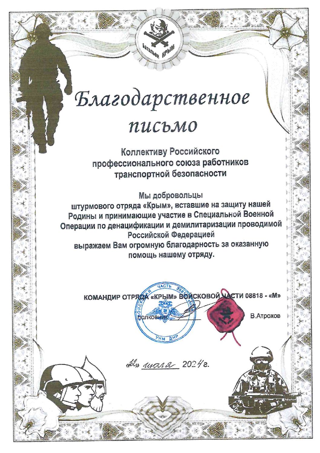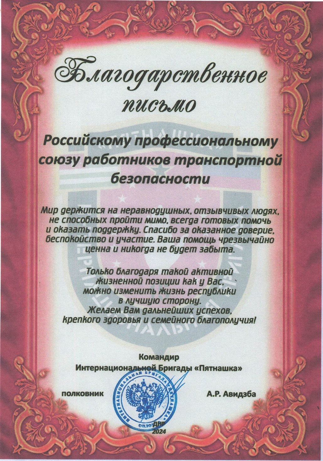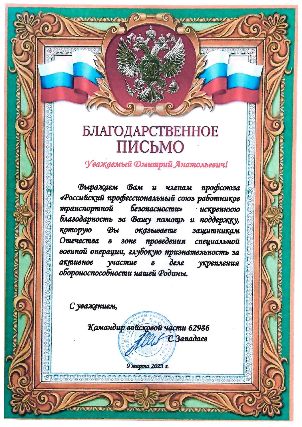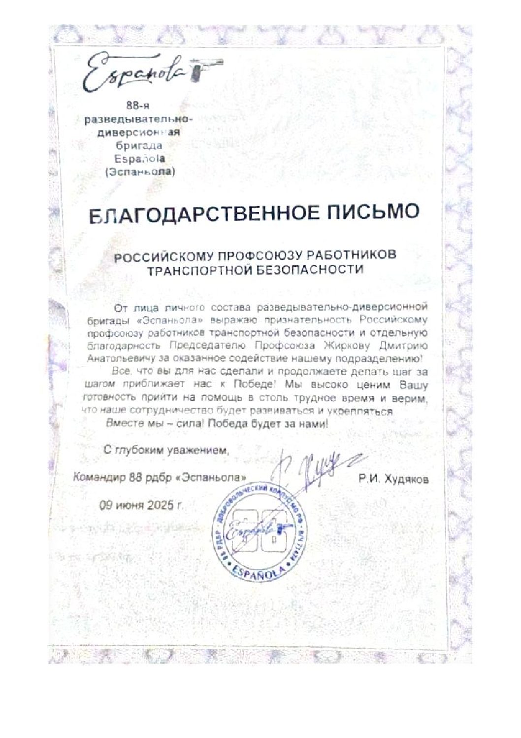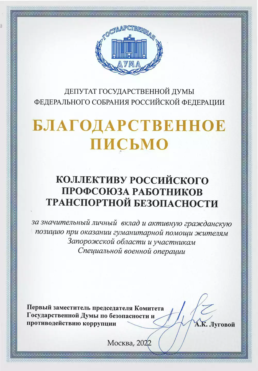 Благодарности Профсоюзу