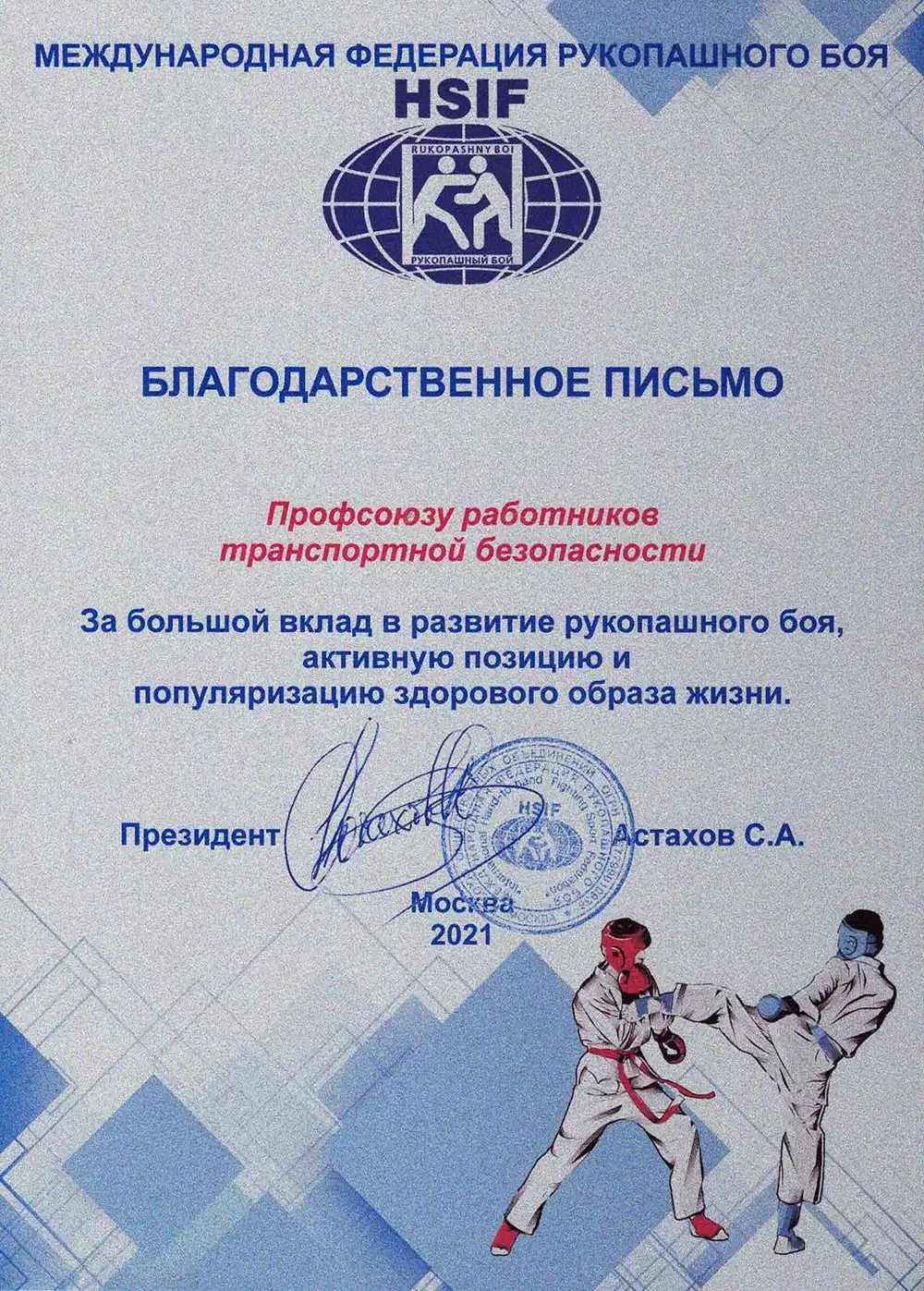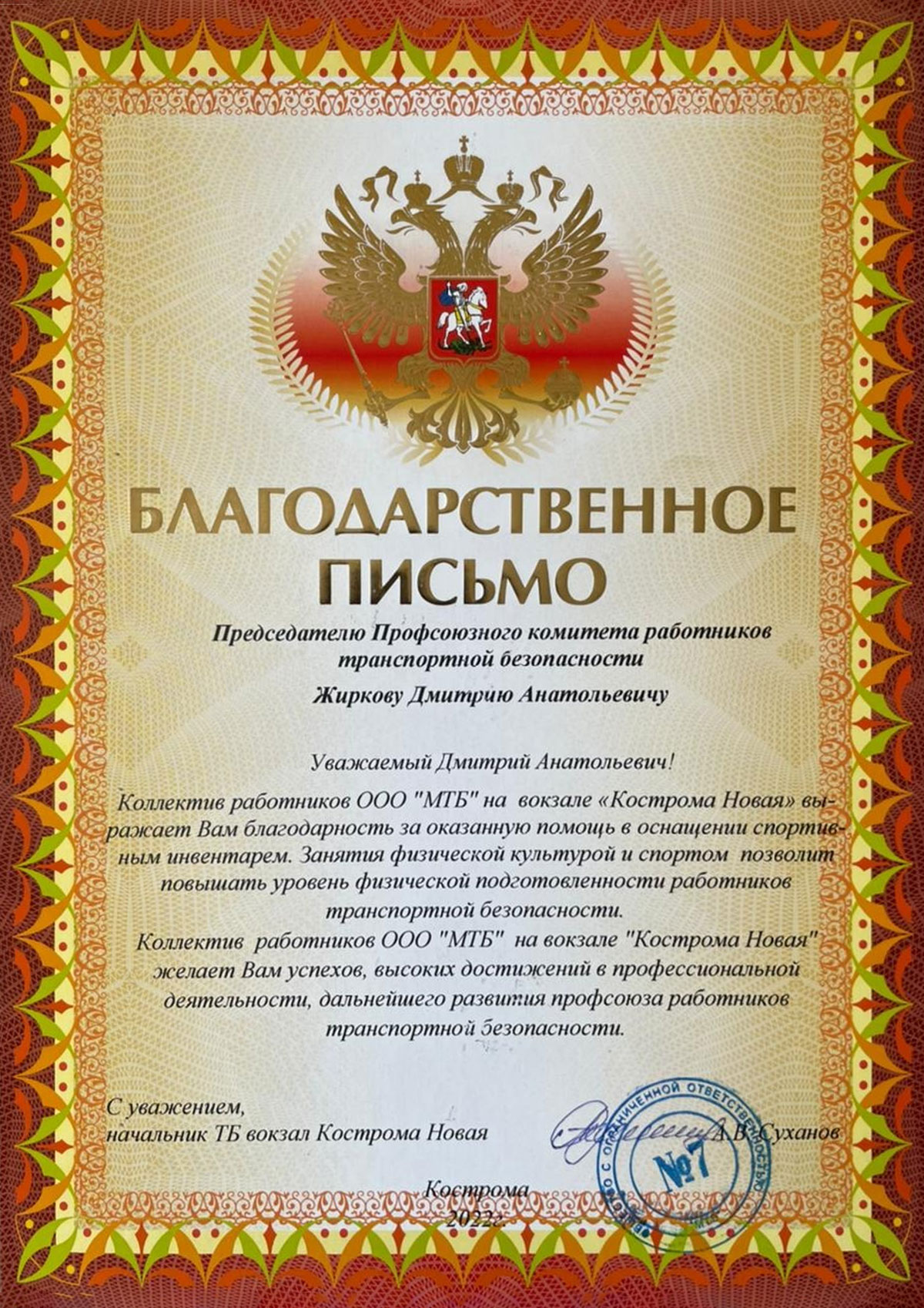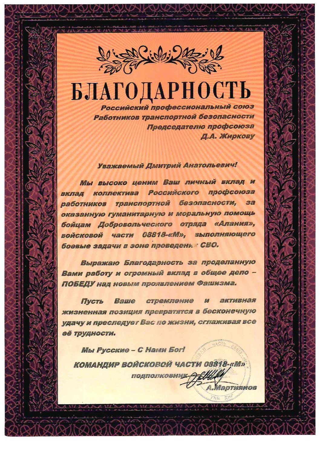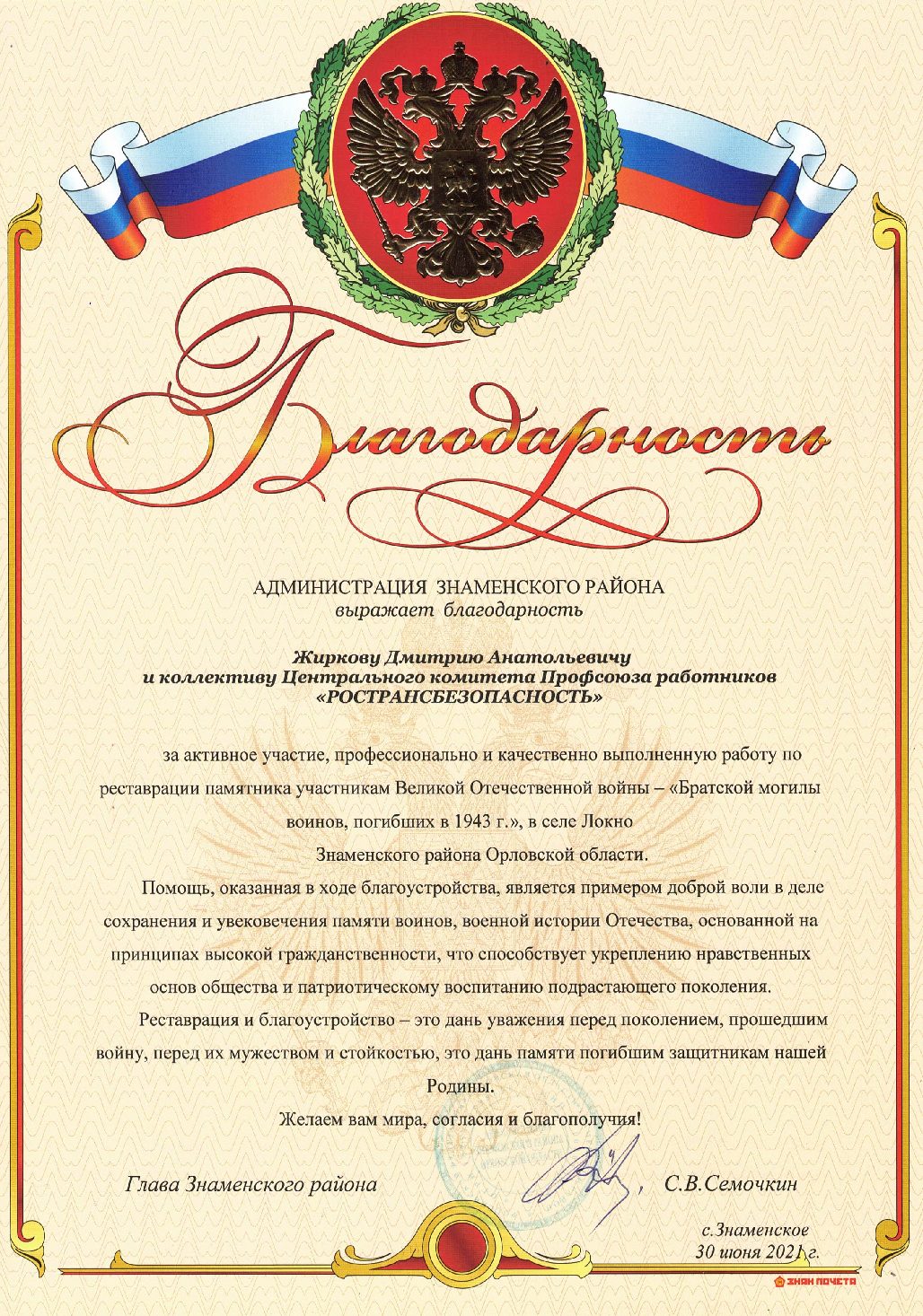 Благодарности Профсоюзу