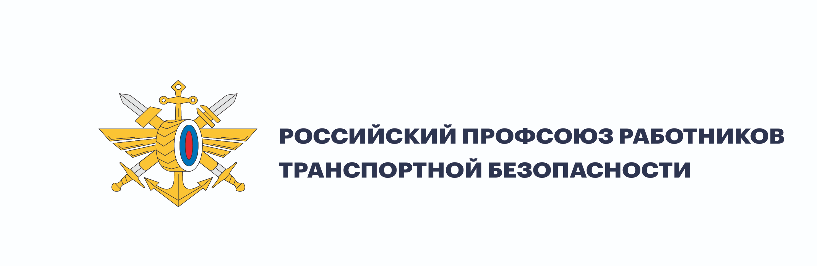 Фирменный блок в основе своей имеет цветную эмблему Российского профсоюза работников транспортной безопасности. Справа от эмблемы текстовое написание синим цветом (Pantone: 0C1D4F) - Российский профсоюз работников транспортной безопасности, выполненное фирменным шрифтом Roboto. Вся композиция расположена на белом прямоугольнике (Pantone: FFFFFF) с соотношением сторон 1:3.